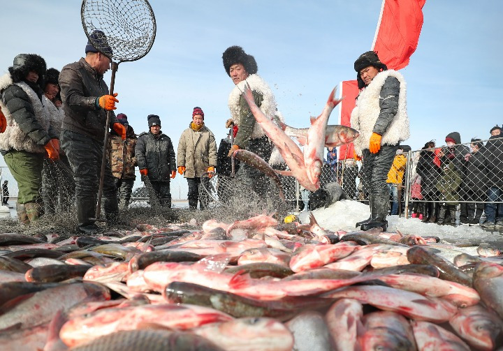 今年62歲的修士忠是家族第三代“魚把頭”。從16歲開始跟著爺爺、父親捕魚的他,如今已有40多年的捕魚經(jīng)驗?!棒~把頭”是整個打魚隊伍的頭領(lǐng)、漁獵文化的繼承者和傳播者,他要根據(jù)經(jīng)驗在冬捕前一天確定作業(yè)位置,并統(tǒng)籌調(diào)度當天各個工種的工作。 識冰,是“魚把頭”最重要的技能?!芭P龍湖總面積127.5平方公里,要在這么大的冰面上確定魚群位置可不容易?!毙奘恐艺f,經(jīng)驗是識冰的重要標準,即使隔著四五十厘米厚的不透明冰面,他也能準確判斷魚群位置和每網(wǎng)出魚量的多寡。 確定好位置,負責鑿冰的漁民便開始用幾十斤重的鐵錐在近半米厚的冰層上鑿冰眼,每隔十多米一個,一網(wǎng)需要鑿近百個。與此同時,負責布網(wǎng)的漁民沿線布網(wǎng),使?jié)O網(wǎng)在冰面下緩緩移動,俗稱“冰下走網(wǎng)”。僅這兩項工作就要持續(xù)6到8個小時。 “網(wǎng)長2000米,寬8米,每個網(wǎng)眼必須控制在6寸?!毙奘恐艺f,嚴格控制網(wǎng)眼大小是為了人為漏掉5斤以下的小魚,讓它們繼續(xù)生長——獵而不絕,是數(shù)千年來打魚人不成文的規(guī)矩。 中午時分臨近收網(wǎng),出魚口安全欄外圍滿了人,大家都想目睹出魚這一壯觀場面。修士忠指揮漁民分工有序地起網(wǎng),網(wǎng)從冰口緩緩?fù)铣?,魚被陸續(xù)拉到冰面上,零下二十多攝氏度的氣溫瞬間被大魚“攪熱”。 “又一‘紅網(wǎng)’!”一名漁民開心大喊。“紅網(wǎng)”意味著這一網(wǎng)捕獲的大魚數(shù)量多,漁民豐收。據(jù)修士忠介紹,臥龍湖冬捕最多的一網(wǎng)曾打上來40萬斤魚。 收網(wǎng)會持續(xù)半天時間,等待買魚的人們有序排隊,張望著出魚口的方向?!斑@魚是母親湖的饋贈,預(yù)示年年有余!”一位剛買到魚的群眾舉著大魚對記者說。 在冬捕前還會舉行祭湖、“醒網(wǎng)”等儀式。在修士忠眼中,這些儀式是為祈求平安,更重要的是表達對自然的尊重與感恩?!拔覐男∩钤谂P龍湖畔,了解母親湖的脾氣秉性。湖給我們美好的生活環(huán)境,我們也要愛護她?!?/span> 人工鑿冰、人工布網(wǎng)、拉絞盤、拽漁網(wǎng),與這些傳統(tǒng)冬捕技藝一同傳承至今的,是人們敬畏自然的理念?!爸挥凶鹬貝圩o自然,才能世代享受自然的饋贈?!毙奘恐艺f。