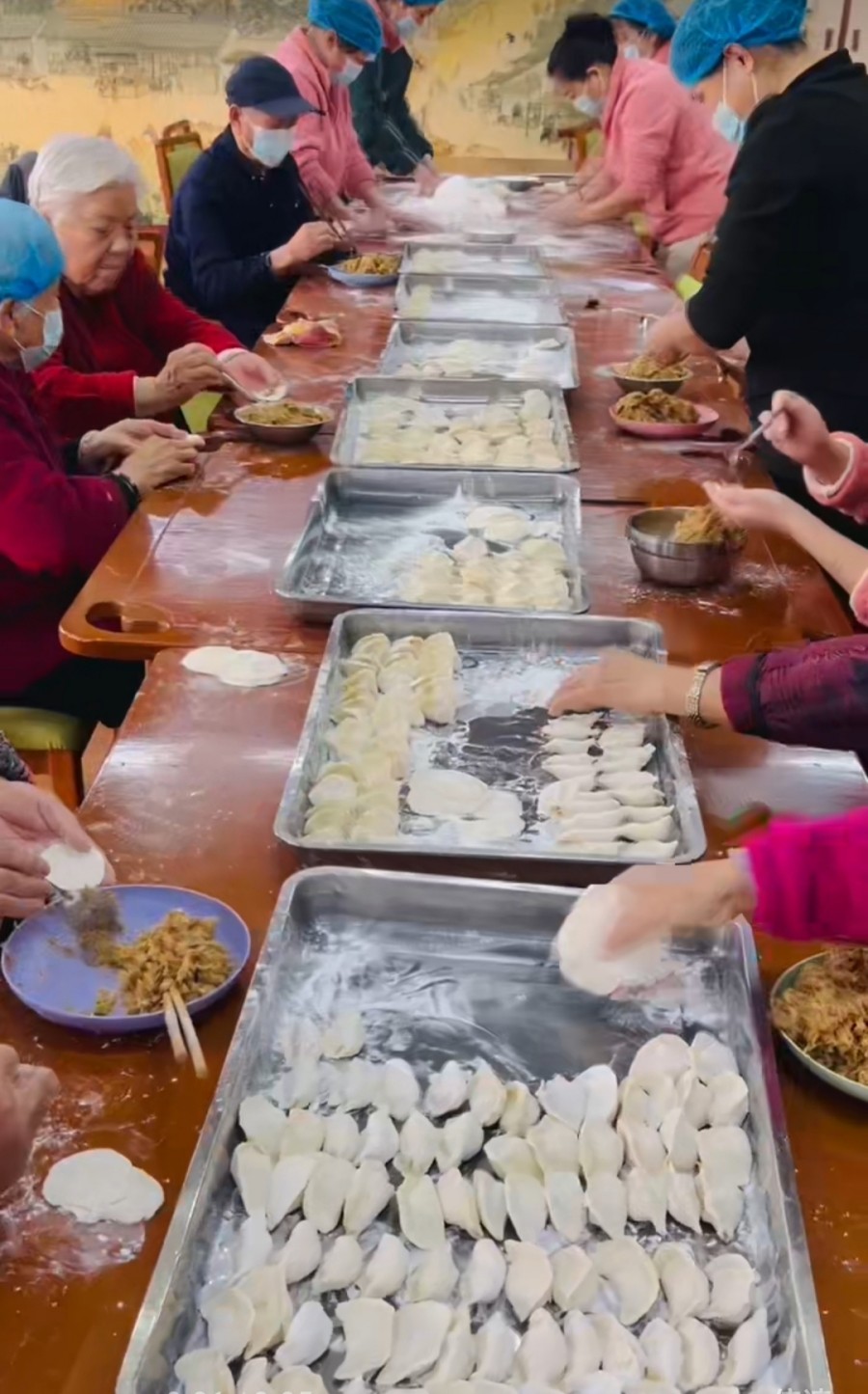 活動(dòng)當(dāng)天,公寓食堂早早布置妥當(dāng),桌上擺滿了面團(tuán)、餡料和工具。老人們興致勃勃地洗凈雙手,與工作人員、家屬一起動(dòng)手,揉面、搟皮、包餡,動(dòng)作嫻熟間笑語(yǔ)不斷。韭菜雞蛋、豬肉白菜等餡料香氣撲鼻,元寶形、月牙形的餃子漸次擺滿餐盤,承載著團(tuán)圓與安康的寓意。幾位擅長(zhǎng)廚藝的長(zhǎng)者主動(dòng)擔(dān)起“指導(dǎo)老師”,手把手教年輕員工包餃子的技巧,暖意在手手相傳中流淌。