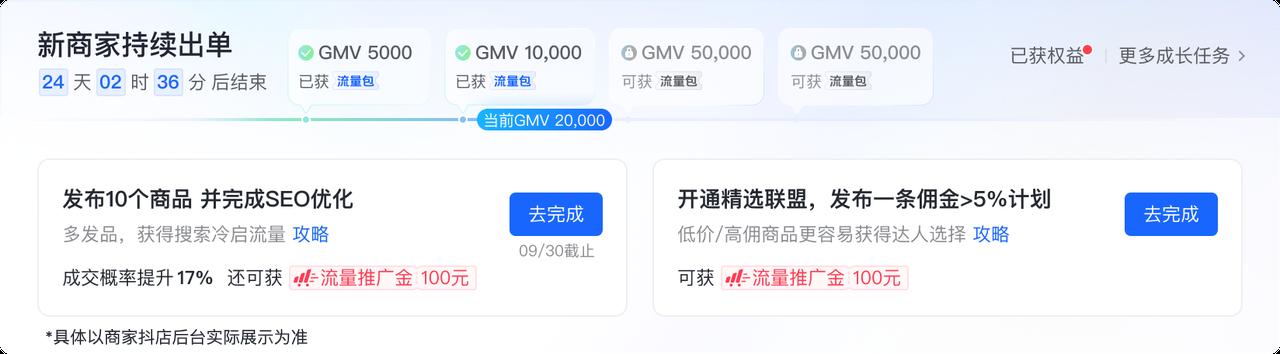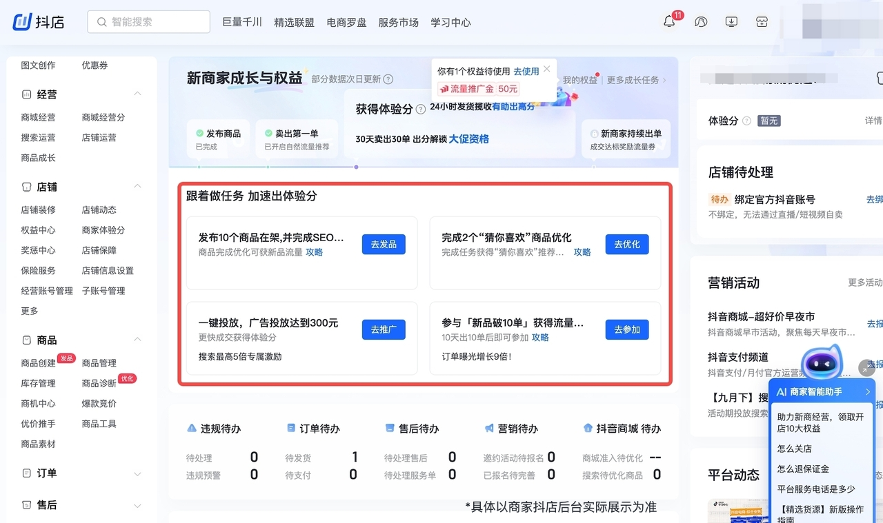 新商家跟著指引走,每個(gè)階段完成相關(guān)任務(wù)或達(dá)到一定目標(biāo),領(lǐng)取相應(yīng)激勵(lì),就能實(shí)現(xiàn)快速躍遷。具體來說:入駐后,發(fā)布一個(gè)商品,新商就能獲得千川新客100元隨心推券等,贏得免費(fèi)增加曝光量的機(jī)會(huì);賣出第一單后,獎(jiǎng)勵(lì)運(yùn)費(fèi)險(xiǎn)30天100單免單等,可以提升商品的價(jià)格優(yōu)勢(shì);30單出體驗(yàn)分后,根據(jù)GMV可獲得相應(yīng)的流量扶持,最高可達(dá)30%。成長(zhǎng)陣地的指引,會(huì)使新手經(jīng)營(yíng)初期更有規(guī)劃、效率更高。