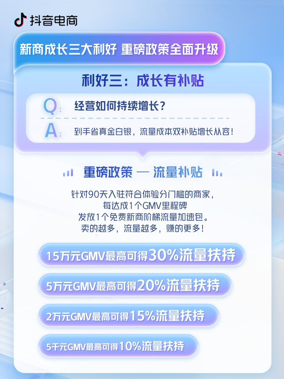 一個(gè)是流量補(bǔ)貼,針對(duì)90天入駐符合體驗(yàn)分門檻的商家,抖音電商會(huì)在達(dá)成GMV里程碑后提供免費(fèi)流量扶持,GMV達(dá)標(biāo)額依次是,5千元、2萬元、5萬元、15萬元,所對(duì)應(yīng)的流量包獎(jiǎng)勵(lì)分別最高是10%、15%、20%、30%,賣的越多,獎(jiǎng)勵(lì)的流量越多。一家賣手機(jī)膜的抖店,靠著12天一個(gè)單品成交了16842單,使得商品曝光增加了452.51%,成功實(shí)現(xiàn)彎道超車,一躍而成平臺(tái)百萬級(jí)別的新商家。