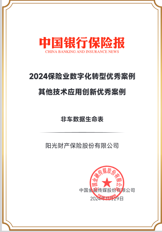 近日,由《中國銀行保險報》主辦的以“提高數智化水平 助力高質量發(fā)展”為主題2024金融業(yè)(保險)數字化轉型大會在廣東汕頭召開。會議同步發(fā)布2024中國保險業(yè)數字化轉型優(yōu)秀案例,陽光財險“非車數據生命表”項目憑借指標配置和智能定價的技術創(chuàng)新,入選“2024保險業(yè)數字化轉型優(yōu)秀案例”。