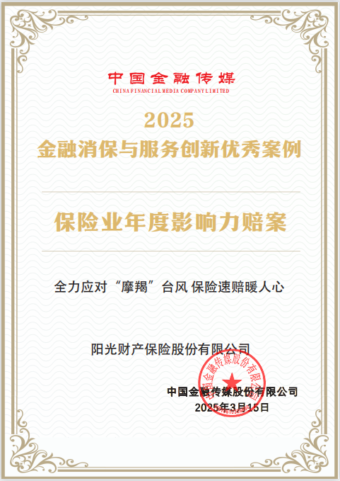近期,中國金融傳媒舉辦“保障金融權(quán)益 助力美好生活”2025金融消保與服務(wù)創(chuàng)新主題直播活動,期間發(fā)布2025金融消保與服務(wù)創(chuàng)新優(yōu)秀案例名單,陽光財險“全力應(yīng)對‘摩羯’臺風(fēng),保險速賠暖人心”案例獲評為“保險業(yè)年度影響力賠案”。