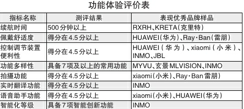 在功能體驗評價方面,15款樣品的續(xù)航時間在97分鐘到673分鐘之間,其中RXRH、KRETA(克里特)品牌的樣品續(xù)航時間在500分鐘以上,表現(xiàn)優(yōu)秀。HUAWEI(華為)、Ray· Ban(雷朋)品牌的樣品佩戴舒適度表現(xiàn)優(yōu)秀;HUAWEI(華為)、xiaomi(小米)、INMO、JBL品牌的樣品控制調(diào)節(jié)裝置便利性表現(xiàn)優(yōu)秀。MYVU、玄景MLVISION、INMO品牌的樣品具備7項及以上的常用功能,功能多樣性表現(xiàn)優(yōu)秀;xiaomi(小米)、Ray·Ban(雷朋)品牌的樣品拍攝功能表現(xiàn)優(yōu)秀;INMO品牌的樣品實時翻譯功能表現(xiàn)優(yōu)秀;xiaomi(小米)、HUAWEI(華為)品牌的樣品語音助手功能表現(xiàn)優(yōu)秀;INMO品牌的樣品具備7項智能創(chuàng)新功能,智能化等級較高,表現(xiàn)優(yōu)秀。