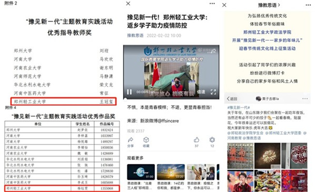 自活動(dòng)開展以來,學(xué)校積極響應(yīng)落實(shí)上級(jí)工作部署,全校各級(jí)團(tuán)組織全面動(dòng)員、積極配合,主動(dòng)利用微信公眾號(hào)、微博等新媒體矩陣進(jìn)行廣泛宣傳,進(jìn)一步深化育人與實(shí)踐融合、線上與線下呼應(yīng)的網(wǎng)絡(luò)思政工作機(jī)制。本次活動(dòng)以紅色文化育人、社會(huì)實(shí)踐育人等方式,通過騰訊微博積極參與#豫見新一代#話題討論,引導(dǎo)青年學(xué)生緊緊圍繞時(shí)代發(fā)展,進(jìn)一步學(xué)習(xí)黨的故事、革命的故事、英雄的故事,感受黨的百年奮斗初心使命和人民群眾幸福生活?;顒?dòng)開展期間,近萬名輕工大青年學(xué)子在做好自身防護(hù)的同時(shí),圍繞“關(guān)愛老年人”“關(guān)愛青少年”“疫情防控”“迎春節(jié)·弘揚(yáng)傳統(tǒng)文化”“運(yùn)動(dòng)技能打卡”“四史學(xué)習(xí)”等主題教育實(shí)踐活動(dòng),以“記錄分享身邊人身邊事”的形式,正確認(rèn)識(shí)、主動(dòng)宣傳、嚴(yán)格服從和積極服務(wù)于防疫抗疫大局,傳承革命精神、孝老敬親扶幼、弘揚(yáng)傳統(tǒng)文化、涵養(yǎng)家國(guó)情懷,共發(fā)表微博1萬余篇,累計(jì)閱讀量達(dá)到20萬余次。其中,國(guó)際教育學(xué)院學(xué)生鄭鵬飛的疫情防控先進(jìn)事跡和政法學(xué)院學(xué)生孫業(yè)凈、曹昕欣、馬景娜的春節(jié)年俗趣味故事被河南省教育廳微信公眾號(hào)“豫教思語”轉(zhuǎn)載報(bào)道。 百年風(fēng)華正青春,踔厲奮發(fā)向未來。此次“豫見新一代”主題教育實(shí)踐活動(dòng)是獻(xiàn)禮“黨的二十大”系列活動(dòng)之一,也是做好該校青年思想政治教育、加強(qiáng)黨的最新理論知識(shí)學(xué)習(xí)的又一舉措,活動(dòng)堅(jiān)持線上線下結(jié)合,創(chuàng)新方式方法載體,深度融入社會(huì)熱點(diǎn),豐富了青年學(xué)生理想信念教育方式,砥礪并凝聚廣大青年學(xué)生為國(guó)擔(dān)當(dāng)?shù)闹練?、骨氣和底?動(dòng)員并引領(lǐng)廣大青年學(xué)生把青春奮斗融入黨和人民事業(yè),以實(shí)際行動(dòng)迎接黨的二十大勝利召開。(范丹瑩)