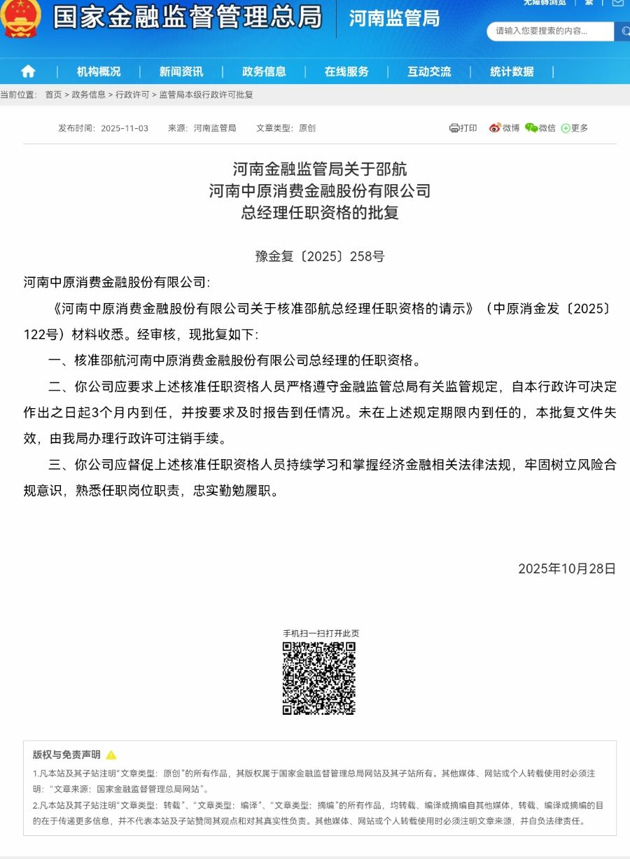 11月7日,國家金融監(jiān)管總局河南監(jiān)管局發(fā)布任職資格批復(fù),核準(zhǔn)邵航河南中原消費(fèi)金融股份有限公司(下文簡稱“中原消費(fèi)金融”)總經(jīng)理的任職資格,邵航正式成為該公司第二任總經(jīng)理。