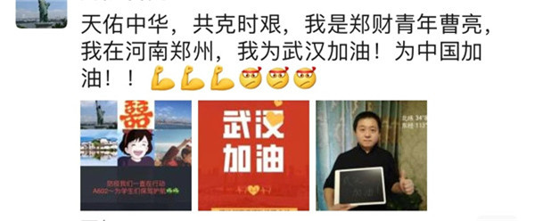 為傳播青春力量,助力抗“疫”信心,鄭州財(cái)經(jīng)學(xué)院團(tuán)委發(fā)起以“天佑中華,共克時(shí)艱,為武漢加油!為中國(guó)加油!——鄭財(cái)青年在行動(dòng)”為主題的朋友圈傳遞助力抗“疫”活動(dòng),共同為抗擊疫情加油。 目前該校已有近2000名師生積極通過(guò)微信分享至朋友圈,用愛心傳遞正能量,凝聚起戰(zhàn)勝疫情的強(qiáng)大力量,給予同胞精神上的支持和鼓勵(lì)。