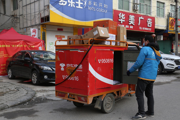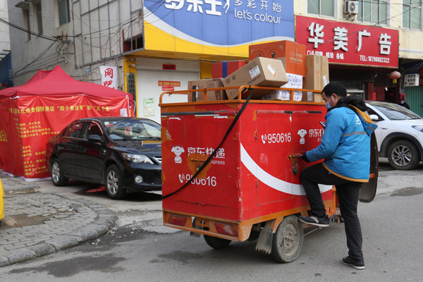 圖為2020年3月1日,兩家快遞小哥送快件時(shí)的情形。