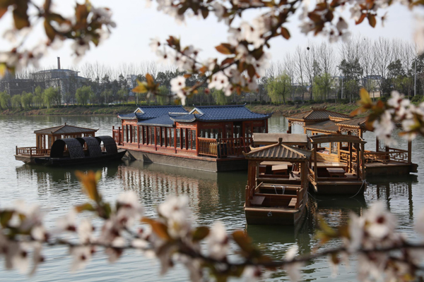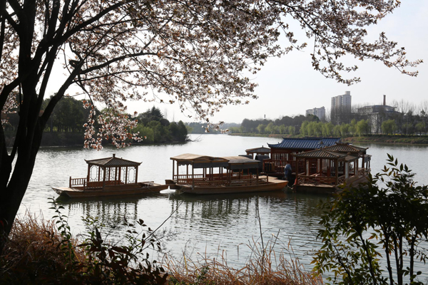 2020年3月15日,在河南省淮濱縣東湖湖心島上,一棵棵櫻花怒放,湖中的游船、烏篷船隨著湖面的習(xí)習(xí)春風(fēng),不時地變換著姿態(tài),一晃一景、一晃一圖、一晃一畫,讓人賞心悅目。(王長江 邱彥文)