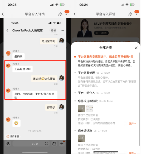 被投訴人:淘寶Chow tai fook大悅城店店鋪 電話:1628****441