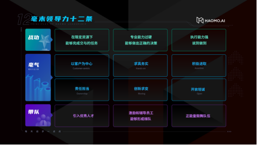 針對此,顧維灝認為,算力、算法與感知硬件的進步作為輔助,能夠為自動駕駛的到來提供加速,但其核心仍然是數(shù)據(jù),數(shù)據(jù)是人工智能最大的驅(qū)動力。在運用數(shù)據(jù)智能推動AI自動駕駛進化的過程中,毫末總結(jié)了自動駕駛能力發(fā)展曲線: F=Z0+M(X),其中F代表產(chǎn)品力,Z0代表毫末第一代產(chǎn)品,M是一個把數(shù)據(jù)轉(zhuǎn)化為知識的函數(shù),包括數(shù)據(jù)獲取、表達、存儲、傳輸、計算、驗證,以及對成本和速度的影響。而毫末打造的中國首個數(shù)據(jù)智能體系MANA便是這最核心的M。目前,MANA的學習時長超過了27萬小時,虛擬駕齡相當于人類司機駕駛2萬年,同時依托于加速增長的大規(guī)模真實道路行駛數(shù)據(jù)的不斷“哺育”,毫末的數(shù)據(jù)閉環(huán)能力也已成功構(gòu)建?!皵?shù)據(jù)智能是 AI 自動駕駛技術(shù)進化的核心,也是毫末的‘思想鋼印’?!鳖櫨S灝總結(jié)稱。 同時,基礎(chǔ)技術(shù)的變化也在驅(qū)動著解決方案的改變,毫末正從第一性原理出發(fā),思考新的解決方案。這一思考的第一個結(jié)果,即是毫末自動駕駛的進化更多依賴數(shù)據(jù)智能體系MANA的進步。對第一性原理的思考與應(yīng)用,推動毫末快速成為乘用車輔助駕駛和末端物流自動配送車領(lǐng)域的領(lǐng)先者。 在乘用車領(lǐng)域,毫末HPilot輔助駕駛系統(tǒng)在一年內(nèi)即完成了3次版本迭代,目前已搭載于長城近十款量產(chǎn)車型,輔助駕駛用戶行駛里程已突破1300萬公里,持續(xù)領(lǐng)跑中國量產(chǎn)自動駕駛市場。此外,毫末HPilot 3.0即將量產(chǎn)交付,帶來以“重感知“為特色的城市NOH功能。末端物流自動配送車領(lǐng)域,毫末與美團、物美、阿里達摩院等頭部合作伙伴達成深度戰(zhàn)略合作,即將量產(chǎn)下線的小魔駝2.0,是全球首款10萬元級末端物流自動配送車,有望推動末端物流領(lǐng)域的自動駕駛進一步落地。 毫末智行成立僅兩年多即躋身自動駕駛第一陣營,不僅源于對技術(shù)創(chuàng)新的信仰與熱愛,毫末的企業(yè)文化也在其中起著潛移默化的影響。顧維灝也詳細介紹了 “毫末智行領(lǐng)導力十二條”, 從戰(zhàn)功、“毫”氣、帶隊三個方面拆解了毫末團隊的領(lǐng)導力要求?!皹溆懈Ψ比~茂,水有源而長流不息,企有魂而基業(yè)長青?!彼硎?隨著公司的快速發(fā)展,每個人都可以在毫末的平臺上擁有更大的發(fā)展空間,都可以通過毫末智行領(lǐng)導力來發(fā)揮更大的價值。希望通過團隊上下的共同努力,將毫末建設(shè)成頂級的自動駕駛公司。