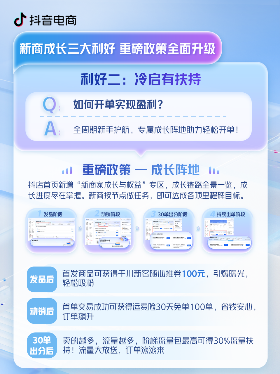 抖音電商對這個痛點有所察覺,“冷啟有扶持 ”就是為了在商家入駐之后幫助他們學習和成長、讓商家消除迷茫。針對此,平臺提出了“全周期新手保護”的概念,其中一個重要的幫助策略是在抖店官網(wǎng)上線了“新商家成長與權益”專區(qū),讓新商戶跟著平臺做任務,在發(fā)品、動銷等各個冷啟動階段不斷完成目標、獲得獎勵,進而實現(xiàn)快速成長。例如,每當商戶發(fā)布一個新品時,就會獲得千川的新客100元“隨心推”券等;賣出第一單后,可以獲得運費險30天100單免單的權益。