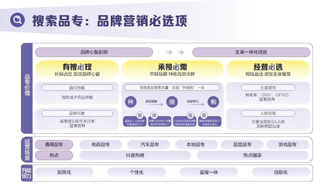 為進(jìn)一步深化搜索品專對(duì)品牌心智、生意一體化經(jīng)營的作用,巨量引擎圍繞品牌營銷全旅程,對(duì)搜索品專進(jìn)行了全面升級(jí):