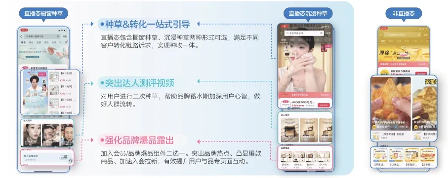 于品牌而言,電商場景重點(diǎn)在于布局「種搜購」鏈路。通過優(yōu)質(zhì)內(nèi)容與搜索觸點(diǎn)的結(jié)合激發(fā)用戶搜索意圖,同時(shí),借助「電商品?!?/strong>精準(zhǔn)捕獲看后搜潛在用戶,再通過品專頁的直播間動(dòng)態(tài)、商品卡展示,引導(dǎo)用戶完成購買決策。面向奢侈品、3C服飾等行業(yè)品宣場景,「品宣品專」、「熱點(diǎn)隨享」融合品牌展示與商品呈現(xiàn),助力品牌快速提升心智和用戶好感度。