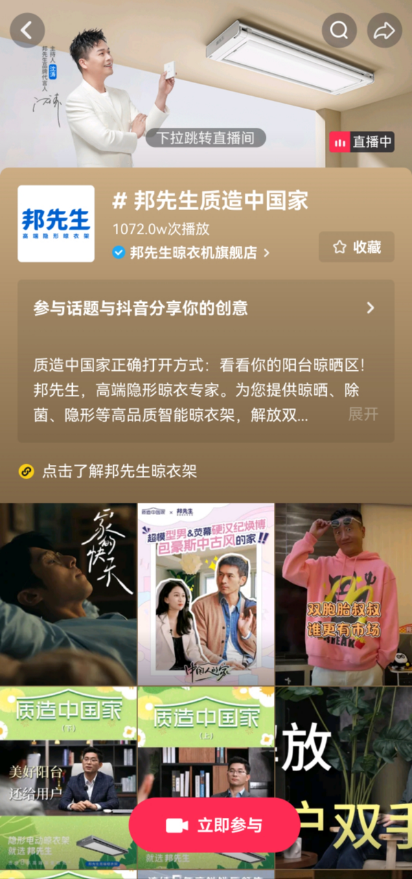 邦先生則聯(lián)動項(xiàng)目邀請@陳靖可 拍攝質(zhì)造中國家創(chuàng)意視頻,攜手@紀(jì)煥博 在視頻中軟性植入產(chǎn)品,抖音王牌資源開屏適時(shí)引爆傳播,配合#邦先生質(zhì)造中國家 話題、店鋪直播、搜索阿拉丁等站內(nèi)外多觸點(diǎn)資源形成合力,多重曝光為站內(nèi)店鋪引流,以抖音渠道專享價(jià)格和免費(fèi)拆裝售后承諾吸引價(jià)格敏感型用戶,單品攀升到電動晾衣架爆款榜TOP1。