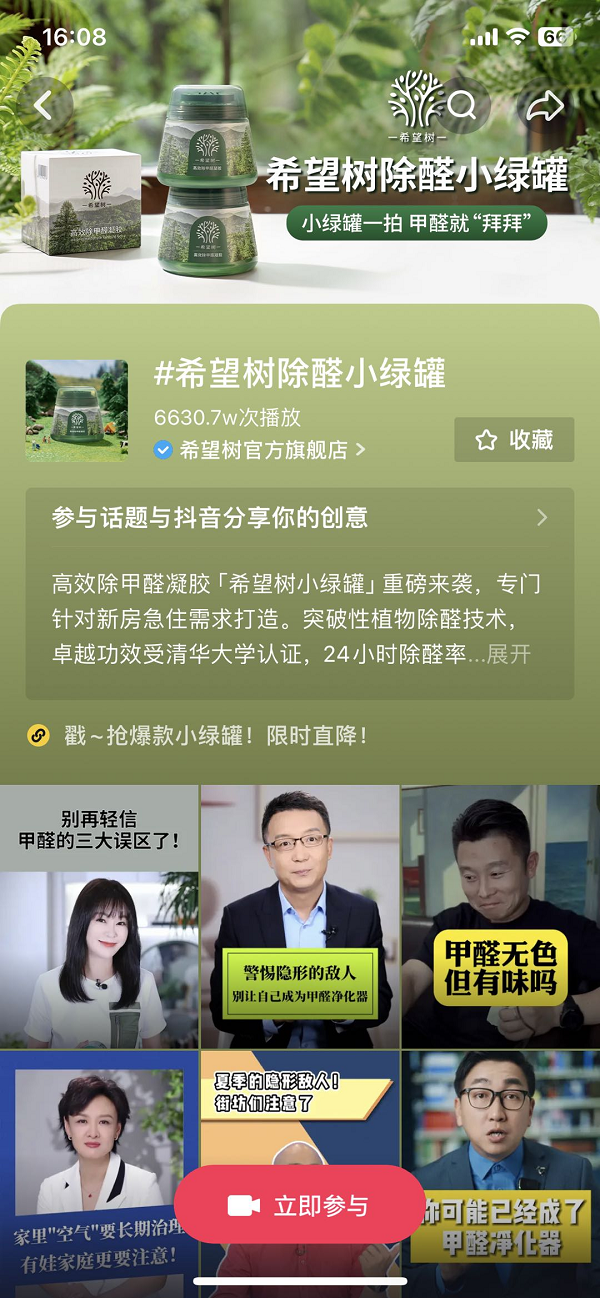 之于家具家裝品牌,「抖in心動家·質(zhì)造中國家」這一活動不僅是釋放「價(jià)格力」、將流量轉(zhuǎn)化為增量的重要機(jī)遇,更是打造「爆品」、流量破圈的關(guān)鍵節(jié)點(diǎn)。以專業(yè)除醛品牌「希望樹」為例,品牌攜高效除醛凝膠「希望樹小綠罐」重磅來襲,入選抖音商城質(zhì)造中國家趨勢金榜,聯(lián)合達(dá)人共創(chuàng)打造#希望樹除醛小綠罐 話題,視頻播放量高達(dá)6633.7萬,結(jié)合商城搜索推薦詞干預(yù)等動作精準(zhǔn)導(dǎo)流至站內(nèi)店鋪,并以強(qiáng)大「價(jià)格力」承接流量轉(zhuǎn)化,一舉打爆小綠罐核心單品。