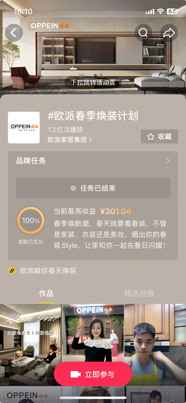 歐派借助明星+達(dá)人矩陣的流量勢能,攜手@陳靖可 、@韓瀟 和其他站內(nèi)達(dá)人打造話題聲量脈沖,實(shí)現(xiàn)品牌和春季家裝煥裝節(jié)點(diǎn)強(qiáng)綁定,最后以大額券強(qiáng)化用戶購買心智。
