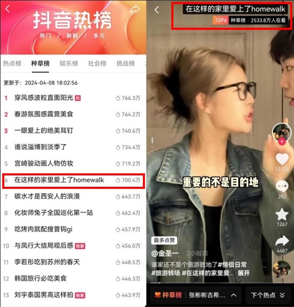 同時(shí),「抖in心動家」結(jié)合春季家裝節(jié)點(diǎn)和站內(nèi)高熱話題citywalk,以家為核心打造新詞「homewalk」,聯(lián)動與家場景強(qiáng)相關(guān)的熱度達(dá)人輸出趣味內(nèi)容,放大活動影響力,商家也可借勢熱點(diǎn)話題,獲得曝光提升。4月8日,熱點(diǎn)話題詞#在這樣的家里愛上了homewalk 攀升至抖音種草榜TOP6,播放量高達(dá)3100w+。商家也能夠通過將這些熱點(diǎn)與自身的商品和短視頻內(nèi)容相結(jié)合,獲取平臺推薦流量,提升內(nèi)容場和貨架場的生意增量。