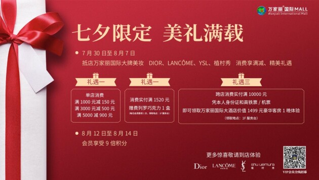 一年一次的浪漫七夕,想和TA在一望無垠的橘子海里看浪漫、俯瞰星城夜幕下的璀璨燈火、享格調(diào)品味的下榻體驗、再共進(jìn)一場燭光晚餐?這次不如嘗試文化特色酒店——萬家麗國際國際大酒店,畢竟,愛也需要新鮮感和新體驗。  萬家麗國際大酒店七夕至臻禮遇。8月1日-4日,萬福中餐廳充值777元送223元,儲值卡總計1000元;再贈70元國際大牌美妝券。(使用規(guī)則:分2次使用,一次僅可使用500元,可與其他優(yōu)惠同享,大廳、包廂皆可使用,儲值卡截止使用期限為2022年12月31日)更多活動詳情請關(guān)注湖南萬家麗實業(yè)集團(tuán)官方微信公眾號。  位于七星設(shè)計標(biāo)準(zhǔn)五星收費萬家麗國際大酒店26樓的萬福中餐廳設(shè)有私人包間28間以及景觀長廊,餐廳聘請全國各地頂級的名廚大師,大董意境菜、果木烤鴨及京式糕點等多款夏日精選美食助力浪漫“七夕之夜”!  萬家麗國際大酒店,擁有萬家麗文化酒店和萬家麗世貿(mào)酒店兩個七星設(shè)計標(biāo)準(zhǔn)五星收費酒店,商務(wù)客房與各類特色客房有近千套,提供休閑享受的一站式服務(wù)。以愛之名,為愛奉送,為游客朋友帶來超豪華寬敞的浪漫空間,加磅助攻甜蜜之夜。  △酒店十四大優(yōu)勢 酒店文化底蘊(yùn)深厚,3萬平方米的世界文化大觀園,容納亭臺樓閣、福地銅雕、文化館等。各大場館的豐富文化內(nèi)涵,不禁讓游人感嘆:“足不出戶,就能在“博物館”里看世界?!?/p> 尤其是今年夏天,繼凌晨爬岳麓山看日出之后,萬家麗廣場28F頂樓的停機(jī)坪,也成為游客新的日落觀賞打卡點。在這片“人間天堂”,萬家麗每時每刻上演的晚霞都美得各不相同。這座停機(jī)坪可容納118架直升機(jī),免費向公眾開放,哪怕人山人海也總會找到合適的空間拍照。  浪漫七夕粉絲節(jié),萬家麗集團(tuán)系列限定企劃,給您專享禮遇,1F DIOR、LANC?ME、YSL、植村秀,以珍禮之藝傳遞甜蜜愛意,邀您探索心意之禮。積分全國通用、價格低于免稅店,更多驚喜敬請到店體驗。  愛情斑馬線,今生和TA一起走 人生的每個路口,都要陪你一起走,從青絲到白發(fā),都要與愛的TA攜手走過,愛的斑馬線空降宇宙中心萬家麗,一起去打卡吧。 愛在緣宇宙 共賞橘子海 晚霞相伴,來一場空中浪漫告白,讓我們的緣分從宇宙中心開始吧!8月4日七夕當(dāng)天,18:00-21:00,出片神址28F萬家麗停機(jī)坪強(qiáng)勢助攻,派發(fā)仙女棒、個性手舉牌,還有專屬攝影團(tuán)隊,讓打卡照氛圍感滿滿 !分享發(fā)布社交平臺即有精美禮遇!關(guān)注“萬家麗國際MALL”微信公眾號了解更多活動詳情。  緣分交友墻 為你牽紅線 緣分交友墻,讓沉睡的多巴胺和荷爾蒙起床吧!在不確定的世界,如何找到確定的那個你,來萬家麗尋找一場未知的邂逅吧。8 月 4 日 11:00-19:00 萬家麗“緣分交友墻”甜蜜上線,助攻單身男女們。貼下期盼,揭走邂逅,以真心換取真心,只要你主動一點點,就會有故事。 霸屏告白 緣定宇宙中心 七夕的主色調(diào)——告白,這次玩點霸氣的!8 月 4 日宇宙中心萬家麗巨幕上演,幫你轉(zhuǎn)達(dá)對TA的愛意,即刻縈繞在這座城市的上空?,F(xiàn)場掃碼關(guān)注萬家麗國際MALL微信公眾號,回復(fù)“我要告白”,上傳您想說的話,就能在大屏幕找到屬于自己的“告白”時刻。愛TA,就一起來萬家麗大屏下,給 TA 一場浪漫告白吧。  告白花園 邂逅心動男友 告白花園,以花悅?cè)?,宇宙中心全城派花? 月 4 日16:00—18:00-20:00, 1F告白花園,向你發(fā)出心動信號。愿所有人在幸福的節(jié)日里,收獲甜蜜心情。 “好柿發(fā)生”潮運大抽獎 嗨翻仲夏夜 8月1日-9月30日,全場購物單次消費滿199元/美妝滿500元/美食滿99元/超市滿99元即可至2F總服務(wù)臺/B2F超市服務(wù)臺領(lǐng)取抽獎券。9月30日19:00線上線下送黃金飾品、國際大牌美妝儲值卡、品牌手機(jī)、超市購物卡、豪華客房券、中餐廳儲值卡。現(xiàn)場還可刮出搖大牌口紅,瓜分千份紅包,心愿盲盒,統(tǒng)統(tǒng)實現(xiàn)! 持續(xù)高能 生活超市全場7.5折 嗨翻暑期,萬家麗生活超市位于萬家麗國際MALL地鐵層(B2層)、地鐵2、5號線直達(dá)賣場;每周二周三會員日享受全場正價商品8.5折;會員免費停車,不定期好禮相送;要購物要囤貨就來萬家麗生活超市! 家居建材全場放價,贏30萬免單 萬家麗家居建材廣場&家居生活廣場聯(lián)手眾多知名品牌,嗨翻暑假!8月21日萬家麗“您購物·我買單”鉅惠讓利,火熱來襲。金幣金蛋,百萬豪禮;全場放價,千萬返現(xiàn)!買建材家具,中三十萬免單,盡在萬家麗。 七夕,與心愛的TA一路相伴,穿越人海,擇萬家麗國際大酒店這個詩意棲居之地,享受物質(zhì)品質(zhì)和精神世界的共鳴,共同奔赴一場充滿愛與美的綺麗之旅吧。