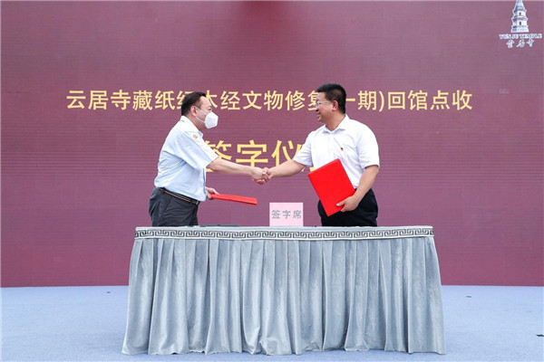 司徒廟為江蘇省級文保單位。廟內(nèi)藏有《楞嚴經(jīng)》《金剛經(jīng)》兩部石刻。其中《楞嚴經(jīng)》與房山石經(jīng)淵源極深。經(jīng)文刊刻于明朝崇禎年間(1628—1637),由吳門章懋德鐫刻,全文6萬余字,共分10卷,刻于84方青石之上,迄今已有340余年。據(jù)明代魏肇魯為《楞嚴經(jīng)》石刻所做題跋可知,該石刻原本要送藏房山云居寺,因明末清兵入關(guān),無法運送,便將石刻藏到獅林寺內(nèi),后移置司徒廟保存。這段記載有力證明了這宗《楞嚴經(jīng)》石刻也是房山石經(jīng)明代刻經(jīng)的重要組成部分,不僅續(xù)寫了綿延千載的刻經(jīng)史,更為深入研究房山石經(jīng)提供了新的思路和方向。 二、展文化,第一階段珍貴文物修復工作圓滿收官。 云居寺珍藏著3萬余件珍貴館藏文物,包括22000余卷明代紙經(jīng)、7000余塊清代龍藏木經(jīng),與14278塊房山石經(jīng)并稱為云居寺“三絕”。